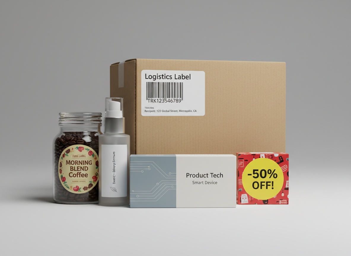 etykiety produktowe, etykiety spożywcze (produkty suche), etykiety kosmetyczne (produkty niewymagające), etykiety logistyczne, etykiety promocyjne i informacyjne