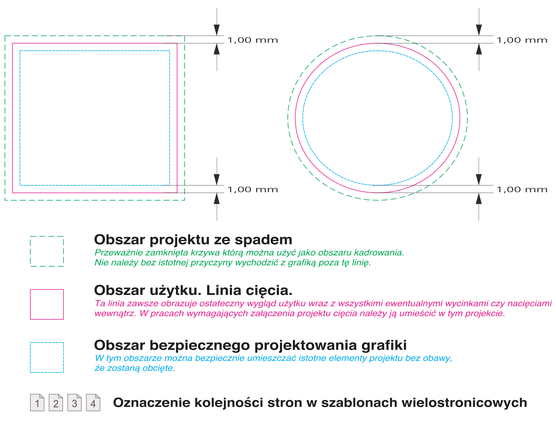 Plik do druku naklejek powinien być zapisany w formacie PDF, w skali 1:1, w kolorystyce CMYK, ze spadami minimum 1 mm oraz bezpiecznym obszarem 1 mm od linii cięcia.